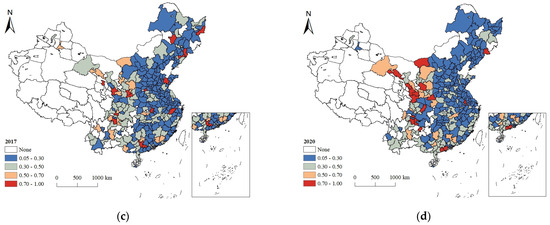 (a) Spatial distribution of LGUE in Chinese cities in 2011; (b) spatial distribution of LGUE in Chinese cities in 2014; (c) spatial distribution of LGUE in Chinese cities in 2017; (d) spatial distribution of LGUE in Chinese cities in 2020.