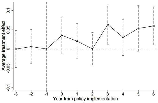 Based on the robust estimator devised by de Chaisemartin and D’Haultfoeuille to deal with heterogeneous treatment effects, this research detects potential heterogeneous treatment effects inside the baseline regression framework [73,74]. The treatment group is composed of those whose policy treatment status changes both before and after the policy enters into effect; the control group is composed of those whose status stays the same. The treatment effect is obtained by contrasting the outcomes of the individuals in the treatment group, who actually receive the treatment, with their counterfactual outcomes, which, after weighted averaging, provides an unbiased evaluation of the policy’s switching effect. As in Figure 4, the event study graphs of the CET pilot in the first three periods and the last six periods are obtained, and the dynamic switching effect in each period can be clearly seen. The grey areas represent 95% confidence intervals, and the solid portion of the line indicates the average policy treatment effect. The policy effect is not clearly displayed prior to the execution of the CET pilot, but, following the opening of the CET market, the policy effect gradually appears. The above results are essentially consistent with the positive and negative trends of the treatment effects in the baseline regression, thereby implying that the benchmark regression passes the heterogeneous treatment effect test.