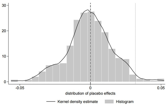 An important fundamental precondition for the double-difference methodology is the parallel trend assumption. However, the parallel trend assumption is inherently untestable because the treatment effect is mixed with the time effect after treatment. It is further examined whether there are confounding events that have been missed, and the possible biases that result. In this paper, the LGUE is validated using a mixed placebo test in time and space. In the mixed placebo test, a number of individuals are randomly selected as the “pseudo-treatment group” from the sample, and a uniform “pseudo-treatment time” is randomly selected for DID estimation to obtain an estimate of the placebo effect. This process is iterated 500 times to derive the distribution of the placebo effects.
