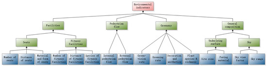 Expert inquiry was applied to assess the importance of the considered environmental features, including 4 broad headings and 16 sub-classes. In the questionnaire, with the same structure corresponding to the AHP hierarchy, spatial features were first divided into four broad headings (as shown in Figure 3), including general composition, pedestrian flow, greenery, and facilities. Then, general composition was divided into the underling surface (including the site size and paving material) and sky (including the sky view factor and sky range) sub-classes; pedestrian flow was divided into internal and external pedestrian flow; greenery was divided into green-vision rate, greening rate, decoration and aesthetics, plant species and richness; and facilities was divided into seats (including the number, distance, and material and form of seats) and fitness facilities (including the number, distance, and type of facilities).