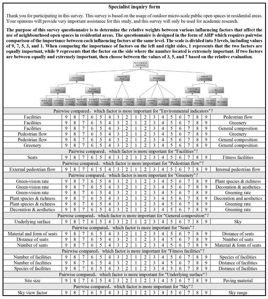 The purpose of this survey questionnaire was to determine the relative weights between various influencing factors that affect the use of neighbourhood open spaces in residential areas. The questionnaire was designed in the form of AHP, which requires pairwise comparison of the importance between each of the influencing factors at the same level. The scale was divided into 5 levels, including values of 9, 7, 5, 3, and 1. When comparing the importance of factors on the left and right sides, 1 represents that the two factors are equally important, while 9 represents that the factor on the side where the number is located is extremely important. If two factors are between equally and extremely important, then a value of 3, 5, or 7 is chosen, based on the relative evaluation.