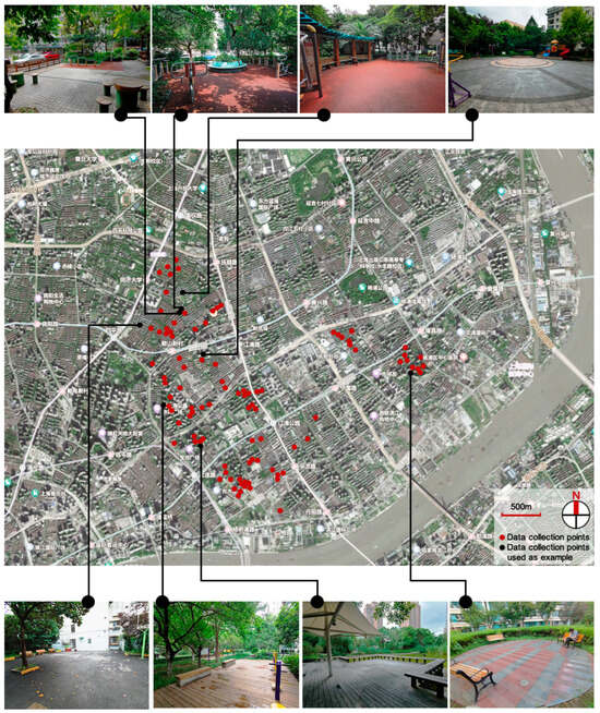 A total of 104 neighbourhood public open spaces (as shown in Figure 4) were measured in Yangpu District, Shanghai, China. This area has a large number of existing residential areas, built from 1950 to the present. As there was a diverse range of residential areas, the open spaces in this district were considered more representative, being conducive to case selection and providing a more comprehensive reference for neighbourhood design and renewal.