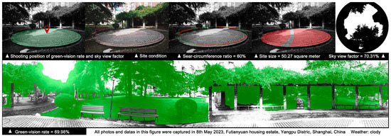 - Green-vision rate. The green-vision rate refers to the proportion of green vegetation within a person’s field of vision. This indicator starts from the embodied scale of environmental perception and is a direct response to the greening situation of the site. For this study, the green-vision rate was calculated based on a 360-degree panoramic photo taken in the geometric centre of the space at a visual height of 1.5 m using a lens with focal length of 1.0 times (as shown in Figure 5). As the green-vision rate is an inherent indicator and the greenness of a site may differ due to seasonal changes, the green-vision rate was calculated based on photos taken in the transition season.