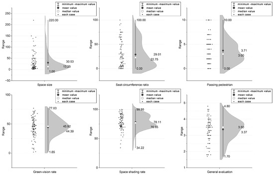 Based on the site size, internal pedestrian flow, sky view factor, green-vision rate, and seat–circumference ratio measurements obtained for the 104 public open spaces in Yangpu District, Shanghai, China, the distributions of these spatial features are shown in Figure 6, and detailed in the following list: