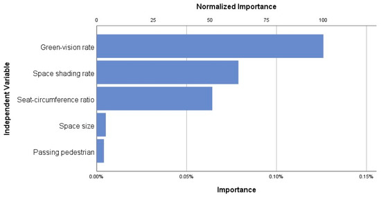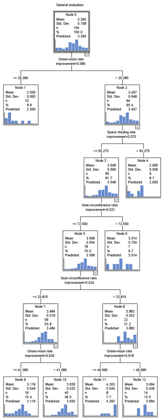 Average assessment of spaces was set as the dependent variable, while the site size, internal pedestrian flow, sky view factor, green-vision rate, and seat–circumference ratio were set as independent variables. Based on the sample size, the minimum number of cases in the parent node was set as 10, the minimum number of cases in a child node was set as 5, and the maximum depth of the decision tree was set to 5 using SPSS 25.0.0.0 software.
