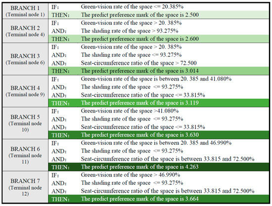 Based on the objective evaluation index system including the five indicators (site size, internal pedestrian flow, sky view factor, green-vision rate, and seat–circumference ratio) selected in Section 5.1, this section aims to determine how these indicators affect the outdoor preferences of residents. Through spatial measurements, on-site structured interviews, and using the decision tree statistical analysis method, this section examines how residents make outdoor decisions.