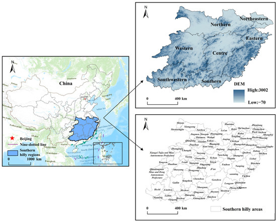 The southern hilly region boasts abundant natural resources and diverse ecosystems, encompassing various ecosystem types such as forests, grasslands, and water bodies (Figure 1). These ecosystems interweave, forming a complex ecological pattern. The region’s climate, influenced by topography, exhibits diversity and can be broadly categorized into subtropical and temperate climates. The impact of monsoons results in uneven precipitation distribution, and the mountainous terrain leads to significant spatial variations in temperature and rainfall. These climatic features provide unique survival conditions for the region’s ecosystems and amplify the impact of LUCs on them. The southern hilly region is also a significant agricultural production area in China, with widespread distribution of farmland. With the development of the economy and society, human activities have had profound effects on land use, including urban expansion, changes in farmland, and forest development. These changes have the potential to impact ecosystem services and bring about a series of ecological risks. Therefore, evaluating land use change predictions and the ecological risk uncertainty of ecosystem services in this region holds crucial scientific significance and practical value.