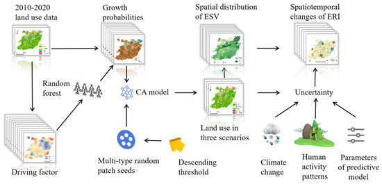The future prediction of land use is crucial for assessing ESV [30], as is evaluating ecological risks and uncertainties [31]. The stability and sustainability of ecosystem services are influenced by various factors, with uncertainty being a significant challenge [32]. Previous assessments of ecological risk in China by scholars have focused on different ecosystems, soils, and urban and regional scales. Solovjova et al. (2019) proposed a method for mathematical modeling and ecological risk assessment of marine ecosystems, considering the combined effects of natural, anthropogenic, climatic, and invasive factors [33]. Zhao et al. (2013) utilized a relative risk model to evaluate the characteristics of ecological risks in Chinese freshwater ecosystems from both regional and overall perspectives [34]. Li et al. (2020) analyzed the surface sediments of six representative mangroves in China, discussing microplastic pollution and its related ecological risks [35]. Yan et al. (2021) evaluated the dynamic variation patterns and influencing factors of ecological risks in the agricultural–pastoral ecotone landscapes of China across different terrain gradients [36]. Zhang et al. (2023) estimated the landscape ecological risk index of different levels, climate zones, and ecosystem types in Chinese nature reserves [37]. Zou et al. (2022) explored the spatiotemporal patterns of ecological risks in Chinese agricultural ecosystems [38]. Chen et al. (2023) investigated the spatiotemporal variation patterns of ecological risks in Nanning City at the optimal scale, predicting ecological risks under two scenarios for Nanning City in 2036 [39]. These studies have explored ecological risks in different regions and ecosystems of China, emphasizing the relationship between ecological environmental changes and human activities. In comparison with existing research, this study focuses on the potential impact of uncertainty assessment on ESV evolution in the southern hilly region, thereby comprehensively assessing ecological risks and providing more flexible solutions for future decision-making.