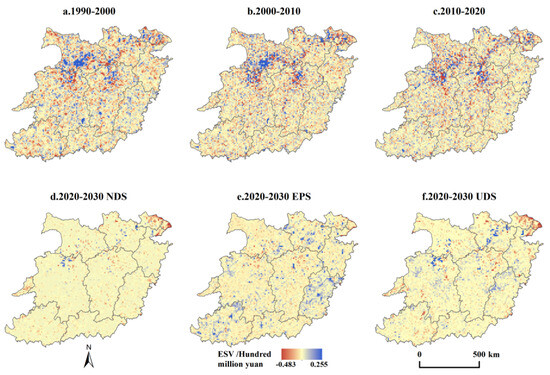 The grid scale allows for a more detailed representation of the spatiotemporal variations in ESV (Figure 5). From 1990 to 2020, the ESV around Wuhan in the northern and around Nanchang in the central of the study area showed significant polarization, with noticeable net increases and decreases. The net increase in area was significantly higher than the net decrease in area from 1990 to 2010, with a net increase in area of around 30% in both 1990–2000 and 2000–2010 (Figure 4). From 2010 to 2020, the proportion of net increase in area decreased to 15%, significantly lower compared to 1990–2010, which was roughly equivalent to the net decrease in the area. From 2020 to 2030, under the NDS scenario, the ESV in the overall study area achieved basic equilibrium, showing no significant net change trend. In the EPS scenario, there are more areas of net increase in ESV across the study area (an increase of approximately 8916 km2). In the UDS scenario, the net increase in the area decreased in the central, southwestern, southern, and eastern parts of the study area, with a noticeable net decrease in the northeastern part.