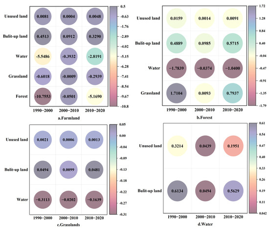 Due to the bidirectional symmetry of land type conversion and the scenario settings in 2030, which resulted in zero conversion areas for some land use types, the calculated CICS results are zero. Therefore, only the unidirectional CICS from 1990 to 2020 is presented (Figure 6). From 1990 to 2000, the CICS for the conversion of forest and water bodies to cultivated land was the highest, indicating high sensitivity of ESV to this type of transition, and such transitions exert a strong inhibitory effect on the development of ESV in the study area. From 2000 to 2010, except for conversions between farmland and water, the absolute values of CICS for other types of land use transitions in the study area were all less than 0.1. This indicates that during this period, there were no significant changes in land use types overall within the study area, and they did not significantly affect the ESV. In the period 2010–2020, the absolute values of CICS for the conversion of forest and water bodies to farmland, as well as water bodies to forest, were relatively high. This indicates that ESV is highly sensitive to these types of conversions, and such transitions exert a strong inhibitory effect on the development of ESV.