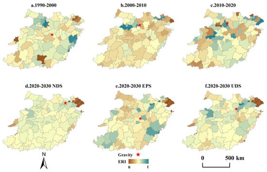 Spatiotemporal changes in ERI from 1990 to 2020 and under various forecasting scenarios from 2020 to 2030.