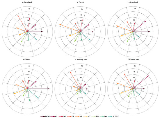 The PLUS model employed the random forest algorithm to investigate the dynamic changes in land use in the southern hilly areas. The goal was to determine the relative impact of various factors on LUCs. Each driver exhibited significant differences in its contribution to LUCs (Figure 8). Population density emerged as the primary factor influencing changes in the farmland area, contributing 16.8%. Additionally, the digital elevation model (DEM) emerged as a crucial factor limiting changes in farmland area, accounting for 13.4% of the total. Annual average precipitation exhibited the greatest contribution (19.0%) to changes in forest area, followed by elevation (11.6%) and slope (11.6%). Annual average precipitation plays a crucial role in vegetation growth and the functioning of forest ecosystems. The varied topography of the southern hilly areas, with significant elevation changes, favors forest growth, while different slopes may lead to soil erosion issues, impacting the formation and stability of forests. For changes in grassland area, annual average precipitation also made the highest contribution (15.4%), followed by DEM (14.8%) and per capita GDP (14.7%), which played important roles in grassland area changes. Topography has a significant impact on factors such as moisture distribution, soil types, and hydrological processes, and different topographies may have a significant impact on the growth and distribution of grasslands. For example, flatter regions may favor the formation and growth of grasslands, while steep terrain may limit the expansion of grasslands. Economic activities may also influence land use and management, with factors such as agricultural development and urbanization potentially changing land cover types and, consequently, affecting the area and distribution of grasslands. DEM (19.1%), slope (13.1%), and annual average temperature (12.3%) had a significant influence on changes in water body area. Topography affects the formation and distribution of water bodies, slope influences water flow and the formation of rivers, and temperature plays a role in the evaporation and melting processes of water bodies. Changes in built-up land area are primarily influenced by population density (27.5%), slope (11.0%), and per capita GDP (10.6%). Areas with high population density often require more residential, commercial, and infrastructure development, making regions with a high population density more prone to an increase and change in built-up land. Steeper slopes may restrict the construction of buildings and infrastructure, reducing the likelihood of land being used for construction. Relatively gentle terrain is more conducive to development, resulting in a relatively smaller impact on built-up land. Regions with higher levels of economic development may attract more investment and demand, leading to land being used for construction and development. Changes in unused land area are primarily influenced by per capita GDP (17.9%), annual average precipitation (15.2%), and population density (15.1%). An increase in the economic development level of a region may imply that more land is developed and utilized, transforming it into construction or agricultural land. Regions with abundant precipitation may find it easier to engage in agricultural development or ecological conservation, while areas with less precipitation may have more unused land. Areas with a high population density may face greater urbanization demands and land use pressure, making them more inclined to utilize unused land to meet the demands of population growth and urban expansion.