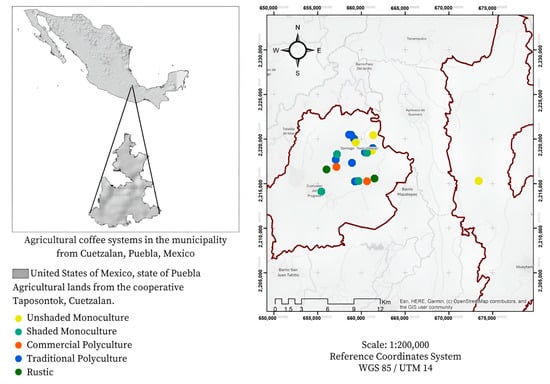 Sampling was carried out in 15 plots of producers located in the “Taposontok” cooperative society of the municipality of Cuetzalan del Progreso, Puebla, with a latitude between 19°57′00″ N and 20°05′18″ N, and a longitude between 97°24′36″ W and 97°34′54″ W [14]. The altitude varies between 180 and 1600 m above sea level. The predominant climate is semi-warm and humid, with year-round rain and an average temperature of 20.3 °C [15] (Figure 1).
