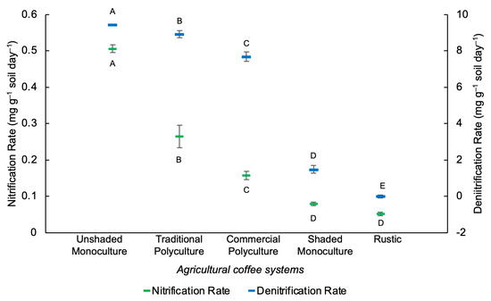 Differences were found in the nitrification and denitrification rates of the five cultivation systems. The Unshaded Monoculture had the highest rate of nitrification (0.506 mg g−1 soil day−1) and denitrification (9.430 mg g−1 soil day−1). In contrast, the Rustic system had the lowest nitrification rates (0.051 mg g−1 soil day−1), and nitrite production was not detected (Figure 2).