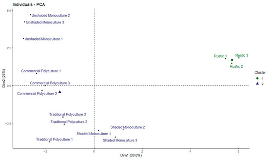 The principal components analyses showed an association of treatments defining two distinct groupings. The analysis showed that 59.6% of the variability can be explained by two main dimensions, Dim 1 (33.6%) and Dim 2 (26%). Furthermore, the plots belonging to the Rustic system had similar properties to each other, which were grouped in Cluster 1 (20%), and are different from the plots of the Unshaded Monoculture systems, Shaded Monoculture, Traditional Polyculture and Commercial Polyculture, which were grouped in Cluster 2 (80%). The differences between the Coffea spp. cultivation systems are visualized, separating the Rustic system, with minimal intervention in its ecosystem, from those with some modification in Figure 3.