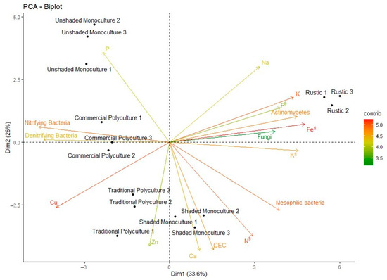 The Rustic Coffea spp. cultivation system was influenced by Fe (leaf) > K (soil) > actinomycetes > K (leaf) > Na > P (leaf) > fungus. In Shaded Monoculture, the variables of N (leaf) > mesophilic bacteria > CEC > Ca were involved. Commercial Polyculture and Unshaded Monoculture systems were influenced by nitrifying bacteria > denitrifying bacteria > P (soil), and Traditional Polyculture was influenced by Cu > Zn.