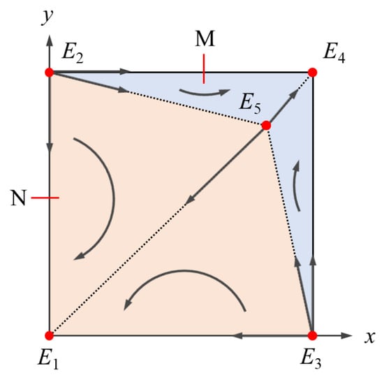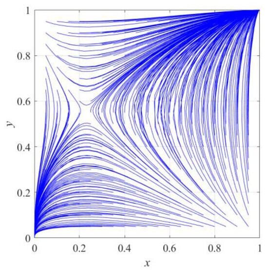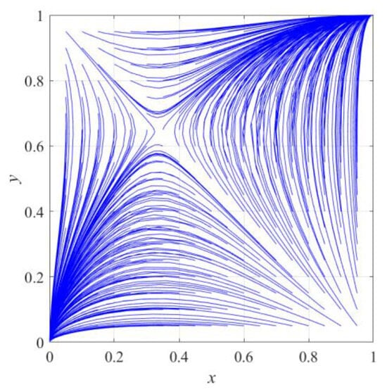 The model reaches a stable state and ceases evolving when the dynamic replication equation equals 0 [48]. By setting and , we derive , , , and as the five equilibrium points for the dynamic game matrix.