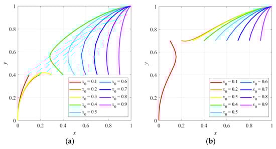 Given the presence of two evolutionarily stable strategies in Scenario 2, we explore whether different initial strategies of game players influence the model outcomes [53,54]. Specifically, we vary the initial proportion of local governments selecting the “promote land redevelopment” strategy () in Scenario 2 while keeping other parameters constant. With fixed at 0.4 or 0.7, assumes values ranging from 0.1 to 0.9, as illustrated in Figure 4.
