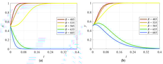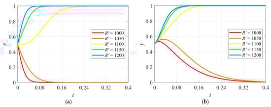 Keeping other parameters constant, we vary from 1000 to 1200 and observe its impact on and in Figure 5. As increases, and transition from 0 to 1, indicating a shift in strategy selection from (0, 0) to (1, 1). This suggests that higher returns for original land users lead to a greater inclination of the government to promote urban old industrial land redevelopment, with original land users more willing to implement the redevelopment. Figure 6 illustrates the impact of changes in values on and , showing an opposite trend to that of . As increases, and change from 1 to 0, shifting the selection strategy from (1, 1) to (0, 0). This implies that reduced benefits from maintaining the current land state prompt original land users to implement industrial land redevelopment, while the government chooses to actively promote it.