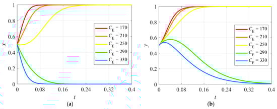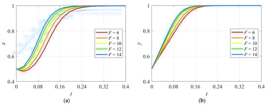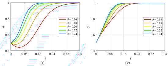 The effects of changes in parameters and on and are depicted in Figure 8 and Figure 9. While represents the proportion of value-added income of land shared with governments as economic subsidies, denotes the fines incurred by original land users for refusing to implement land redevelopment when the government actively promotes it. Regardless of the values of and , the final strategy remains (1, 1) when the initial strategy is (0.5, 0.5). However, the time required to reach stability decreases with increasing values of and , indicating a higher likelihood of game players choosing (implement, promote). Hence, we deduce that local government intervention, specifically through the implementation of economic subsidies and punitive measures, facilitates the advancement of inefficient industrial land redevelopment. The effectiveness of incentives and punishments needs further analysis.
