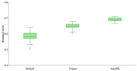 Boxplot of accuracy scores for RF which determined by default, expert and AutoML, respectively.