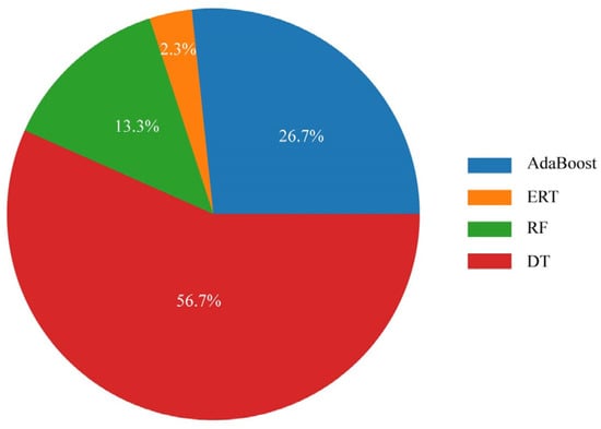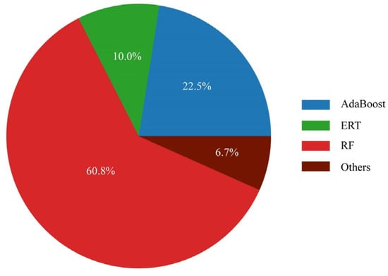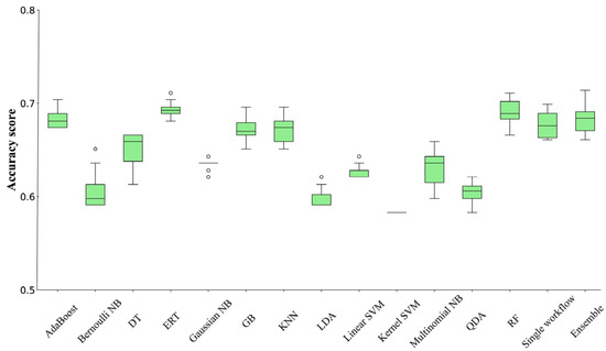Figure 4 illustrates the performance of AutoML which extended the number of potential ML methods from one to all thirteen. Under these conditions, the accuracy scores of the workflows determined by AutoML were very close to the highest performing workflows determined by AutoML for each ML method individually. In total, four ML methods were most selected by AutoML in the 30 repeated three-fold cross-validation, i.e., AdaBoost, DT, ERT, RF (Figure 5). Among those ML methods, the most selected ML methods (i.e., RF, ERT, AdaBoost) are the three highest performing methods when each ML method was determined by AutoML individually. However, other ML methods (e.g., DT) were also potentially selected by AutoML. This contributed to the lower accuracy scores compared to RF, ERT, AdaBoost which were determined by AutoML individually.