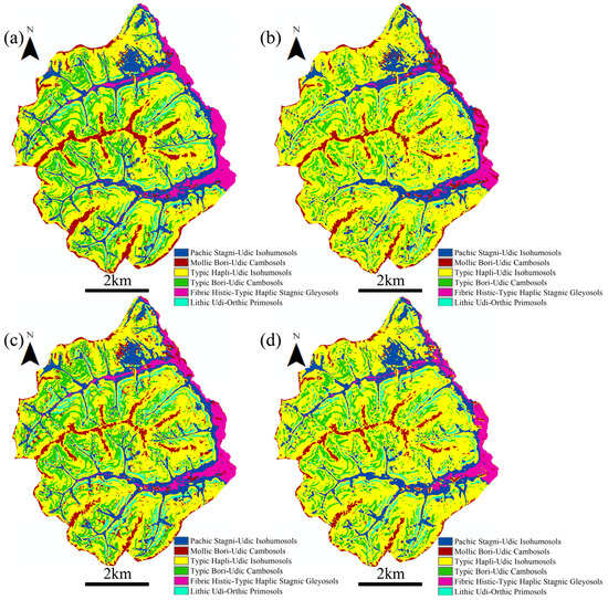 The spatial distribution of soil subgroups generated by AutoML. (a,b) represent the maps with the best and worst evaluation accuracy scores by single workflow, respectively. (c,d) stand for the maps with the best and worst evaluation accuracy scores by the ensemble, respectively.
