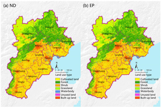 Land use patterns under the (a) ND scenario and (b) EP scenario in 2035.