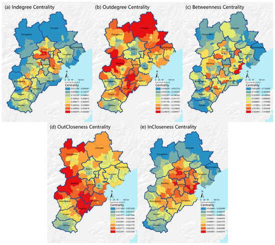 Carbon emission network in the BTH urban agglomeration: (a) indegree centrality, (b) outdegree centrality, (c) betweenness centrality, (d) out-closeness centrality, and (e) in-closeness centrality.