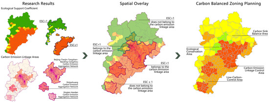 The carbon balance zoning planning was based mainly on the ESC results discussed in Section 4.1.4 and the carbon emission linkage area summarized in the carbon emission network within the urban agglomeration discussed in Section 4.2.1. According to the planning method of carbon balance zoning plan in Section 3.4.1, we divided the zones into four types of zones, and the division process is shown in Figure 8. We divided the BTH urban agglomeration into 33 carbon sink balance areas, six ecological conservation areas, 88 carbon emission linkage control areas, and 74 low-carbon control areas (Table 8).