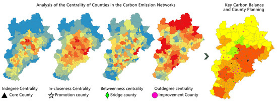 Based on carbon balance zoning planning, the centrality of each county was calculated. The study identified the characteristics of each county in the carbon emission network. Building upon the centrality analysis of each county within the carbon emission network outlined in Section 3.3, four key counties were determined based on the scores of urban agglomerations in the above four indicators: core county, promotion county, bridge county, and improvement county. Among them, counties with higher indegree centrality were designated as core counties, counties with higher in-closeness centrality were designated as promotion counties, counties with higher betweenness centrality were designated as bridge counties, and counties with higher outdegree centrality were designated as improvement counties.