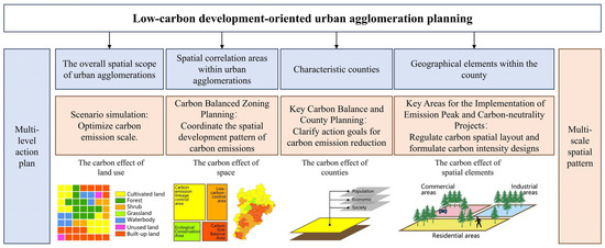 Still, many gaps exist in current research on carbon emissions within urban agglomerations. Because of a lack of data, most studies can focus only on the carbon emissions of some large cities with recorded data, and the research locations are individual, not universal. In addition, due to limited interannual records of historical data, the data analysis results are applicable only to the policies and economic conditions at that time, making it difficult to align with recent carbon emission reduction governance policies. Moreover, most carbon emission simulations focus only on simulating future land use patterns or providing macro-policy recommendations to reduce emissions and enhance foreign exchange in the research area as a whole [20]. Few studies have simulated the land use patterns of LCD scenarios or formulated detailed and feasible planning guidelines for different administrative regions informed by the location and socioeconomic attributes of cities [21]. The classification types and methods of carbon balance zoning, as well as the planning guidelines for different regions to undertake the functions of increasing emissions and reducing emissions, remain unclear, and the theoretical basis needs to be improved.