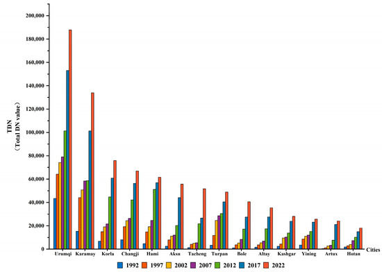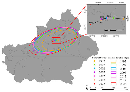 - Changes in the total nighttime light value: The total nighttime light value of cities in Xinjiang has been increasing year by year, with significant growth rates during the periods of 1992–1997 and 2007–2017. Influenced by the development of cities in southern Xinjiang such as Kashgar City and Korla City, as well as the rapid development of areas in the east like Yining City, the regional center of gravity in Xinjiang has noticeably shifted towards the southwest direction from 2012 to 2022.
