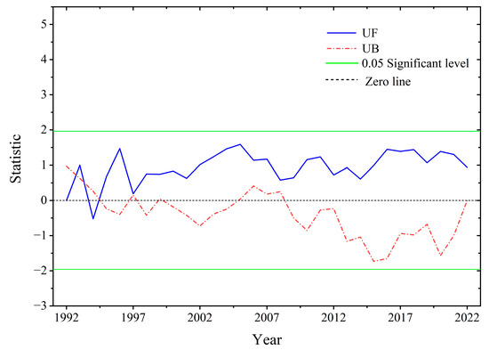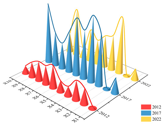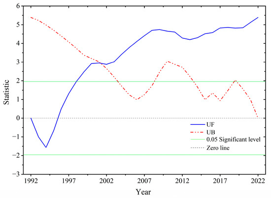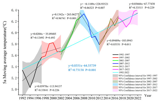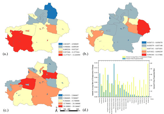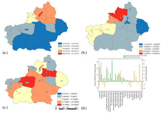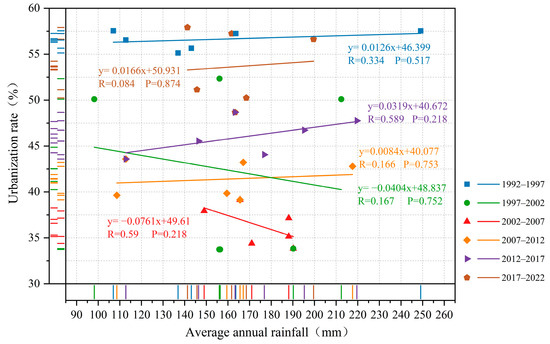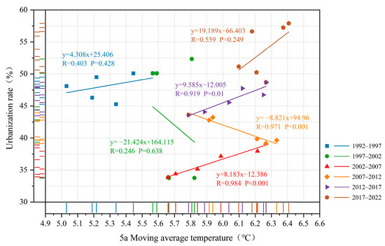 - Relationship between climate factors and urban development: From 1992 to 2022, the 5-year moving average of annual temperature and annual precipitation in Xinjiang showed an upward trend, with growth rates of 0.036 °C per year and 0.57 mm per year, respectively. With the increase in temperature and precipitation, the urbanization rate in Xinjiang exhibited an upward trend after experiencing fluctuations.