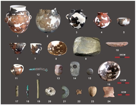 Artifacts excavated from various structures of the centripetal compound building in Shirenzigou: 1. double-handle jar (F7); 2. four-handle pot (F7); 3. double-belly pot with two handles (F7); 4. painted double-belly pot with two handles (F7); 5. double-ring flat-bottomed cauldron (F2); 6. double-handle ring-footed pot (F7); 7. single-handle cup (F7); 8. basin (F3); 9. stone grinding plate (F7); 10. stone grinding rod (F7); 11. painted single-handle pot (F4); 12. bronze knife (F7); 13. stone pestle (F1); 14. stone hoe (F1); 15. stone ball (F2); 16. crucible (F7); 17. tooth harpoon (F7); 18. bronze awl (F7); 19. bone tube (F7); 20. stone spindle whorl (F7); 21. scepter head (F7); 22. toy made out of a sheep astragalus (F3); 23. stone spinning top (F3); 24. pottery shard (F4). The image was made using CoreDRAW Graphics Suite 2016 (www.corel.com).