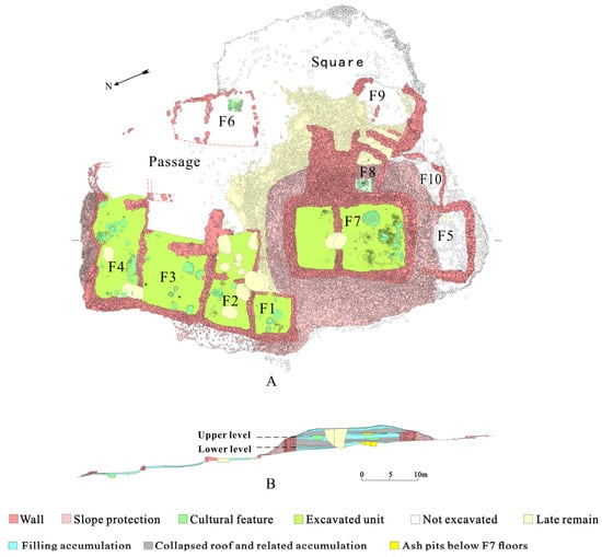 In the first phase, the smaller structures F1–F4 and F6 were semi-subterranean, while F7 and its annex F8 were built at ground-level. The status of units F9 and F10, whether they were also ground-level constructions, remains unclear due to limited excavation data. In the later phase, the floor level of the smaller houses was raised slightly, approximately 0.45 m to 0.5 m, while the floor of F7 was elevated by 2 m, effectively turning it into a platform structure encircled by retaining walls. A sloping pathway leading to F7’s original entrance was built, linking this central structure with the rest of the settlement. In the late occupation phase, this path began 9 m below F7’s highest point, highlighting a significant elevation difference between the smaller structures and the central building. The walls of F7 pressed down F1 and the annexes F5, F8, and F10, which suggests that these structures had already been abandoned by the later period. The buildings retained abundant relics and artifacts in their original positions, supporting a rapid abandonment with minimal disturbance. Both layers of ground floor above F7 showed collapsed accumulations of burned wooden structure roofs, indicating that likely the abandonment was due to fire [51,53,54,57] (Figure 3).