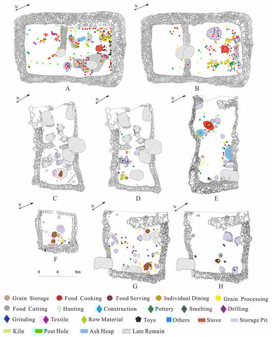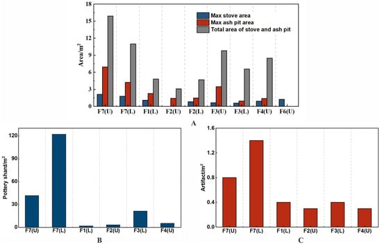 In structures F1–F4 and F6, the amount and volume of various types of features and artifacts were roughly proportional to the interior floor space (Table 3; Figure 5 and Figure 6A). The densities of pottery shards and other artifacts, including ceramic, stone, and metal items, as well as their distribution, type, size, ratio, and combination exhibited little variation across the smaller houses (Figure 5 and Figure 6B,C; Tables S2 and S3), indicating their similar nature. Yet, significant disparities were observed when compared to the larger structure, F7 (Figure 6; Tables S2 and S3). The stove and ash pit areas were considerably larger compared to those in the smaller dwellings (Figure 6A; Table S2). The artifact count in F7 was markedly higher, with cooking and dining utensils found in quantities ranging from 7 to 23 times those found in the other buildings. The dimensions of cooking implements, grain storage, and serving vessels in F7 were also substantially larger, with diameters and heights exceeding 0.5 m and some reaching up to 0.7 m in diameter and 0.6 m in height (Figure 2). Noteworthy were 11 and 9 large stone grinding plates found on the lower and upper floors of F7, respectively, along with 19 storage devices on each floor of the building. Unit F7 also contained unique relics and artifacts not found in other houses, including ceramic kilns, bronze ware, painted large pottery vessels, jars with double-looped ring feet, oversized single-handled goblets, crucibles, and stone scepter heads, among others (Figure 2; Table 3). These observations highlight the potential special function of F7 as a central architectural feature within the settlement.
