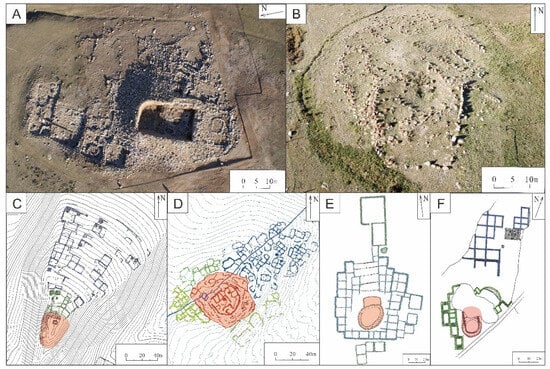Centripetal compound structures identified in the Tianshan Mountains: (A). Shirenzigou [57]; (B). Xiaoheigou [86]; (C). Hongshankou [85,87]; (D). Kuola North Building Group [88]; (E). Yuegongtai-Xiheigou (Nijiaebo Group) [80,89]; (F). Yuegongtai-Xiheigou (Shuangzhe’ebo Group) [80,89].