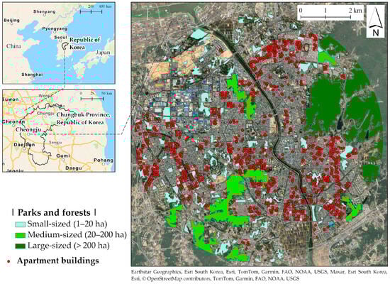 Figure 1. Map of parks and forests and the locations of apartment buildings in Cheongju City, Chungbuk Province, Republic of Korea, created using ArcGIS Pro 3.1 [38].