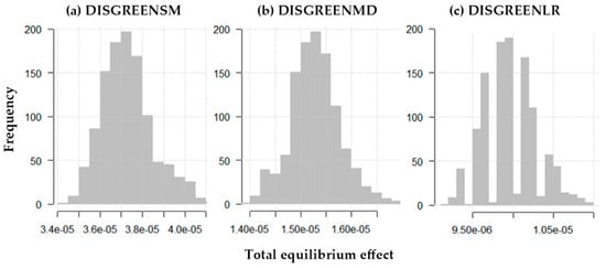 Figure 2. Histograms of the total impacts for DISGREENSM, DISGREENMD, and DISGREENLR.