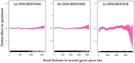 As illustrated in Equation (6), a GAM was fitted to examine the shape of the relationship between the proximity of apartments to neighboring urban green spaces and apartment prices. As with the SAR model, our analyses were primarily focused on the features of spatial decay for the three variables DISGREENSM, DISGREENMD, and DISGREENLR. In the empirical GAM in Equation (6), the linear (parametric) portion consisted of three variables—FLOORAREA, FLOOR, and AGE, whereas the non-parametric portion comprised the remaining eleven predictors, including the three proximity-to-green-space variables. Similar to the SAR model, the response variable was the log-scaled apartment selling prices. Table 4 summarizes the estimation results of the GAM.