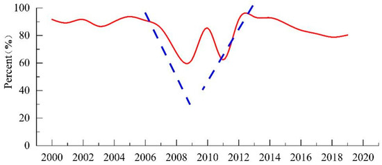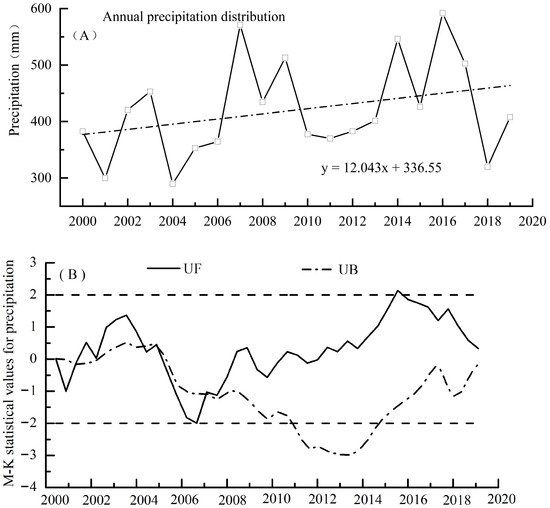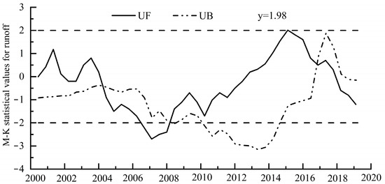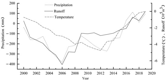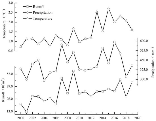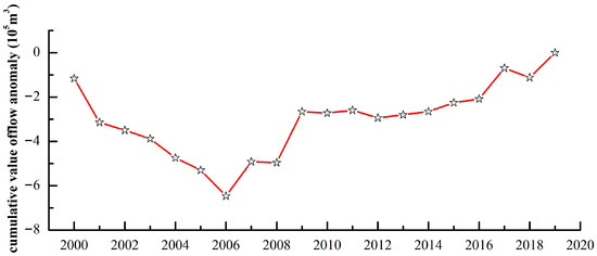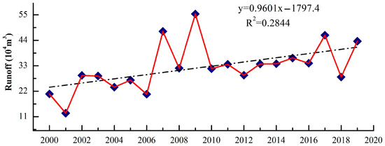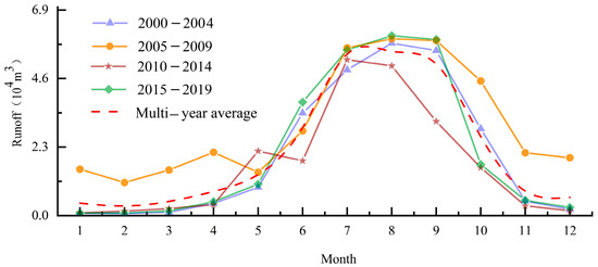 - The runoff from July to September accounted for 85.36% of the total. It was also found that the annual surface runoff in the basin fluctuated over the 20-year period but had an overall upward trend, increasing by 3.94 × 105 m3, with an average increase rate of 0.42 × 105 m3/10a. During 2006 to 2010, the annual runoff increased significantly and fluctuated greatly, forming an ‘M’-type change trend, with 2007 and 2009 as the peaks and 2008 as the valley. The maximum value of the annual distribution concentration Ci of runoff was 63.52%, corresponding to 231° in the vector direction, which appeared in 2000–2004, and the minimum value was 57.15%, corresponding to 227° in the vector direction, which appeared in 2015–2019, with an average value of 60.29%. The correlation between the runoff and precipitation was significantly high (r = 0.839, p < 0.05), whereas the correlation between air temperature and surface runoff was low (r = 0.421, p > 0.05), showing that the runoff was controlled mostly by precipitation.