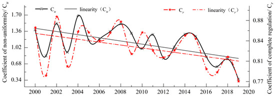 - The annual runoff distribution in the Pailugou Basin gradually became smooth and uniform from the initial large fluctuation. Meanwhile, with the passage of time, the variation trend of the annual distribution uneven coefficient (Cu) of the runoff was highly consistent with the curve fluctuation of the complete regulation coefficient (Cr). The annual runoff of the Pailugou Basin exhibited an increasing trend during the fluctuation.