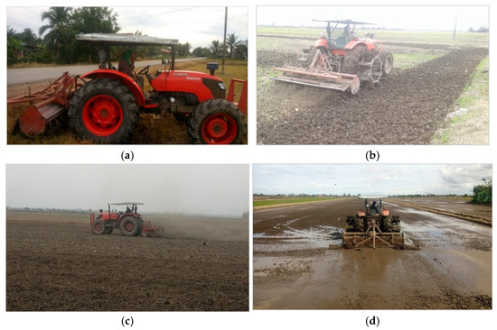 Rice is the most produced and consumed cereal in Malaysia [1]. The average amount of rice produced in Malaysia in 1968 was 1.4 million tons, which has increased by 57.2%, with 2.3 million tons produced in 2016. With proper infrastructural support and the development of new rice varieties by the government, the country’s average yield increased from 2.9 tons/ha in 1980 to 3.8 tons/ha in 2014 [2]. Land preparation in rice cultivation is performed to provide suitable growing conditions for optimum plant establishment. The result of any good land preparation activity is the facilitation of effective weed control and the enhancement of water-use efficiency during the crop-growing season. Tillage is also a concern as it facilitates the movement of air and water through the breaking up and pulverization of soil [3]. Tillage operations in rice cultivation are used to enhance soil surface roughness and aerate soil by increasing porosity and stimulating the decomposition of crop residues. Hence, tillage is considered a key factor in optimizing growth. In rice cultivation, tillage usually takes place at least twice in one growing season. It consumes up to 59% of the total diesel required for all operations in crop production [4]. Performance data on tractors and implements constitute a crucial factor for the management of agricultural machinery; they facilitate and support the optimal selection of suitable tillage machines for a particular farm, which minimizes crop production energy input [5].