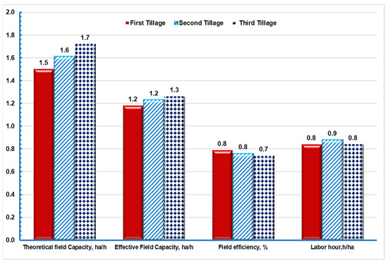 Among the three tillage passes, the results revealed that the highest field capacity and lowest fuel consumption were recorded in the third tillage pass (1.3 ha/h and 6.87 L/ha), while the lowest field capacity and highest fuel consumption were recorded in the first tillage pass (1.2 ha/h and 8.43 L/ha). This reflects the effect of the wide working width (3 m) of the rotary tillers used in the third tillage pass, compared with the working width of the rotary tillers used in the first and second tillage passes (2.7 m). Therefore, less field time was required in the third tillage pass because the wide width necessitates fewer tractor passes to cover the farm area.