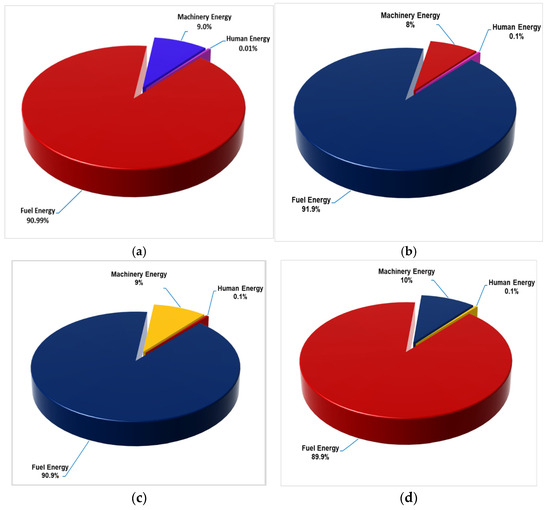 Distribution of energy sources in different tillage operation passes (Average of main season and off-season). (a) All tillage passes. (b) First tillage pass. (c) Second tillage pass. (d) Third tillage pass.