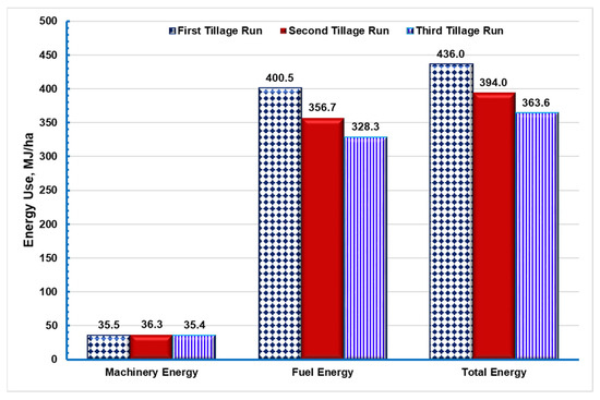 The results revealed that in all tillage passes, energy expenditures due to the fuel consumption of the tractor accounted for the share contribution of the total energy and was followed by the energy expended through machinery use. The last contribution among the three energy sources was energy use due to human labor (Figure 5).