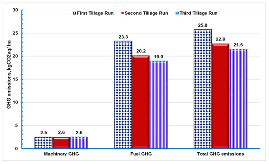 The results revealed that in all tillage passes, GHG emissions from fuel consumed by the tractor accounted for the highest share of the total GHG emissions and was followed by machinery GHG emissions (Figure 9).