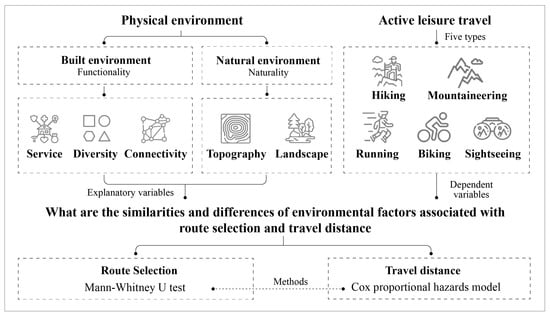 Sedentary lifestyles and a lack of daily physical exercise increase the risk of chronic diseases including obesity [] and cardiovascular disease []. Given that walking or cycling are among the most common and accessible forms of exercise [], experts are now interested in the potential health advantages of active leisure travel [,]. The term “active leisure travel” in the context of this article refers to a variety of travel modes for recreational purposes that can enhance physical activity levels, such as walking, cycling, running, hiking, and mountaineering, among others [,]. These activities typically occur in various settings, including urban streets, nearby green parks, or forest parks situated in suburban areas. There are at least three explanations for the considerable and growing research interest in active leisure travel: First, changing lifestyles associated with increasing socioeconomic status can lead to more time allotted to pursuing active leisure activities, which are associated with greater life satisfaction []. As a result, a growing number of people are engaging in experience-based leisure travel in their daily lives []. Second, active leisure travel, which may provide moderate-intensity activities that can be incorporated into daily life directly and decrease the share of motorized travel indirectly, has the potential to contribute to public health, energy efficiency, congestion reduction, and air pollution alleviation [,]. Third, compared with more utilitarian journeys that, in contrast to leisure travel, place a higher priority on efficiency, leisure travel is more likely to take place on safe, comfortable routes rather than on the quickest routes [,]. Urban planners seek to increase these “detours” to increase the exposure and duration to attractive and beneficial elements of the built and the natural environments [].