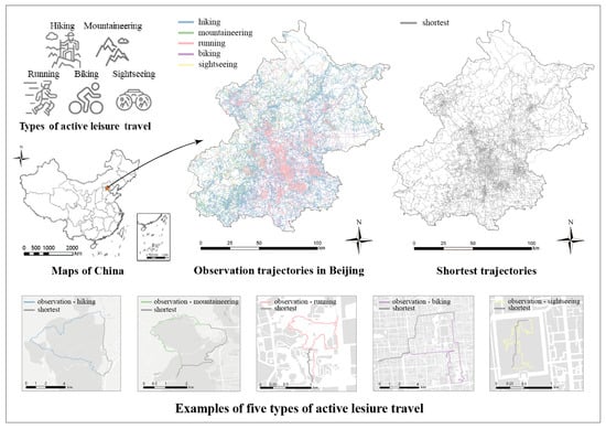 The original data consists of approximately 12.6 million GPS trajectories. The data cleaning procedure involved several steps: Firstly, trajectories that were entirely located within Beijing were extracted, while those spanning across provinces were excluded. Trajectories exhibiting distance errors exceeding 5% or displaying evident anomalies were removed. Subsequently, trajectories were filtered based on the mode of travel. Since the sample size for several activities (skiing, sailing, fishing, paragliding, and GPS painting) was very small, the primary active leisure travel included in this paper were hiking (43,343; 42.3% of trips), climbing (46,963; 45.8%), cycling (5239; 5.1%), running (5767; 5.6%), and sightseeing (1142; 1.1%), which together accounted for 102,454 individual trips (see examples of the five types of active leisure travel in Figure 2).